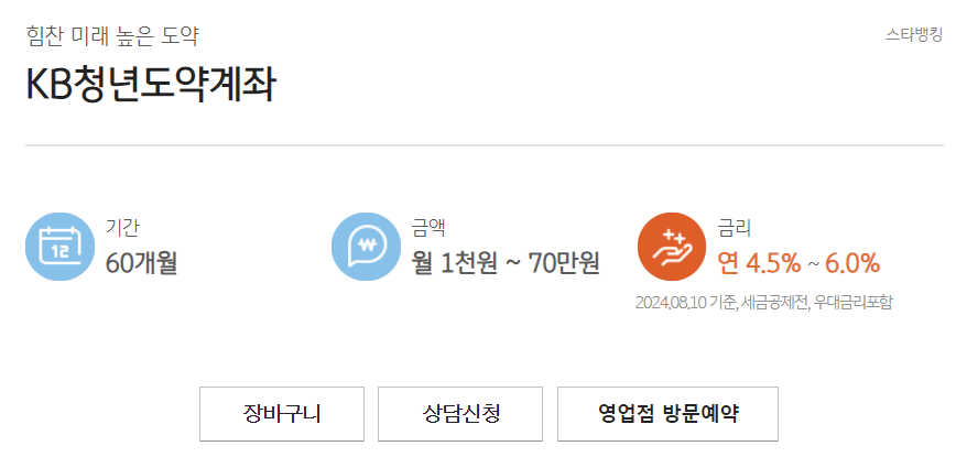 | KB국민은행 | 4.50% | 우대금리 최대 1.00%p ① [급여이체] 이 적금의 신규일이 포함된 달부터 만기 전전월 말까지 급여 입금 월수가 36회 이상인 경우: 0.60%p ② [자동이체]이 적금의 신규일이 포함된 달부터 만기 전전월 말까지 본인 명의 KB국민은행 입출금통장에서 아래 1) 또는 2)의 자동이체 출금이 발생한 경우: 0.30%p 1) 월 2건 이상의 공과금 자동이체 월수 36회 이상 2) 청년도약 LTE 요금제의 자동이체 출금 월수 36회 이상 ③ 계약기간 중 주택청약종합저축 신규 가입 고객 또는 가입일 기준 KB청년희망적금 만기 해지 고객: 0.10%p |