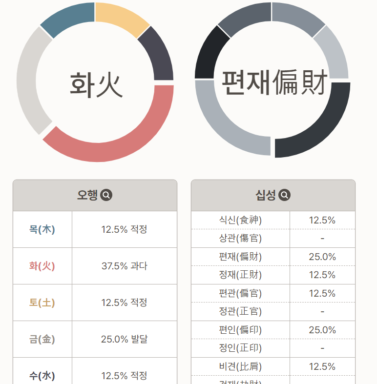 스크롤을 좀 더 내려보시면 아래의 사진과 같이 "오행"을 확인하실 수 있는데요.