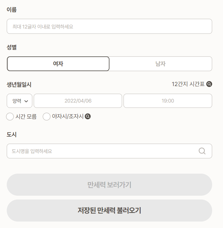 : 먼저 이름, 생년월일, 태어난 시각, 도시를 순서대로 입력해 줍니다. 시간을 모르신다면 "시간 모름"을 클릭하세요.