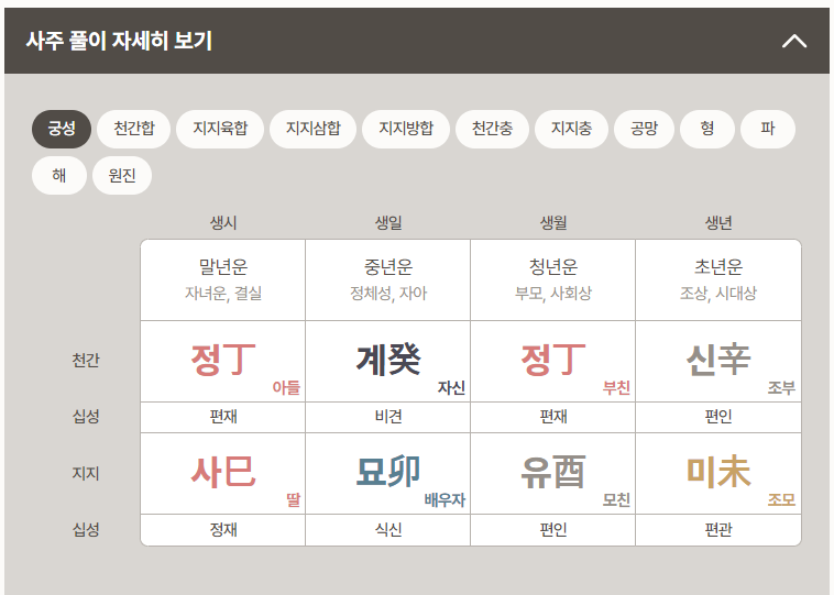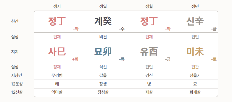 그 외 일주, 십성, 신강/신약, 대운/연운을 해석하는 방법은 아래에서 확인해보시기 바랍니다.